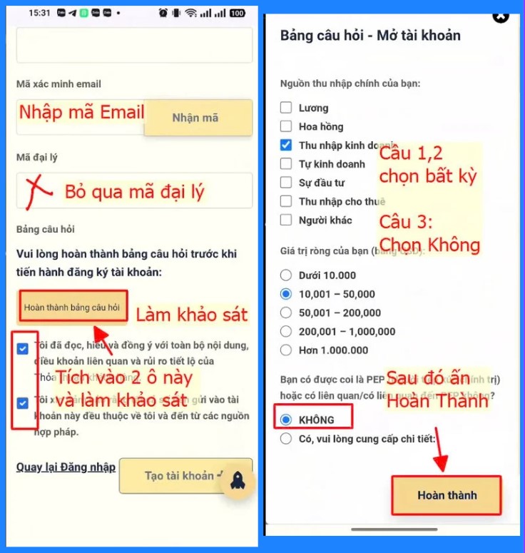 Hoàn thành khảo sát là bước quan trọng để đăng ký. Xem ảnh bên dưới để làm theo nhé.