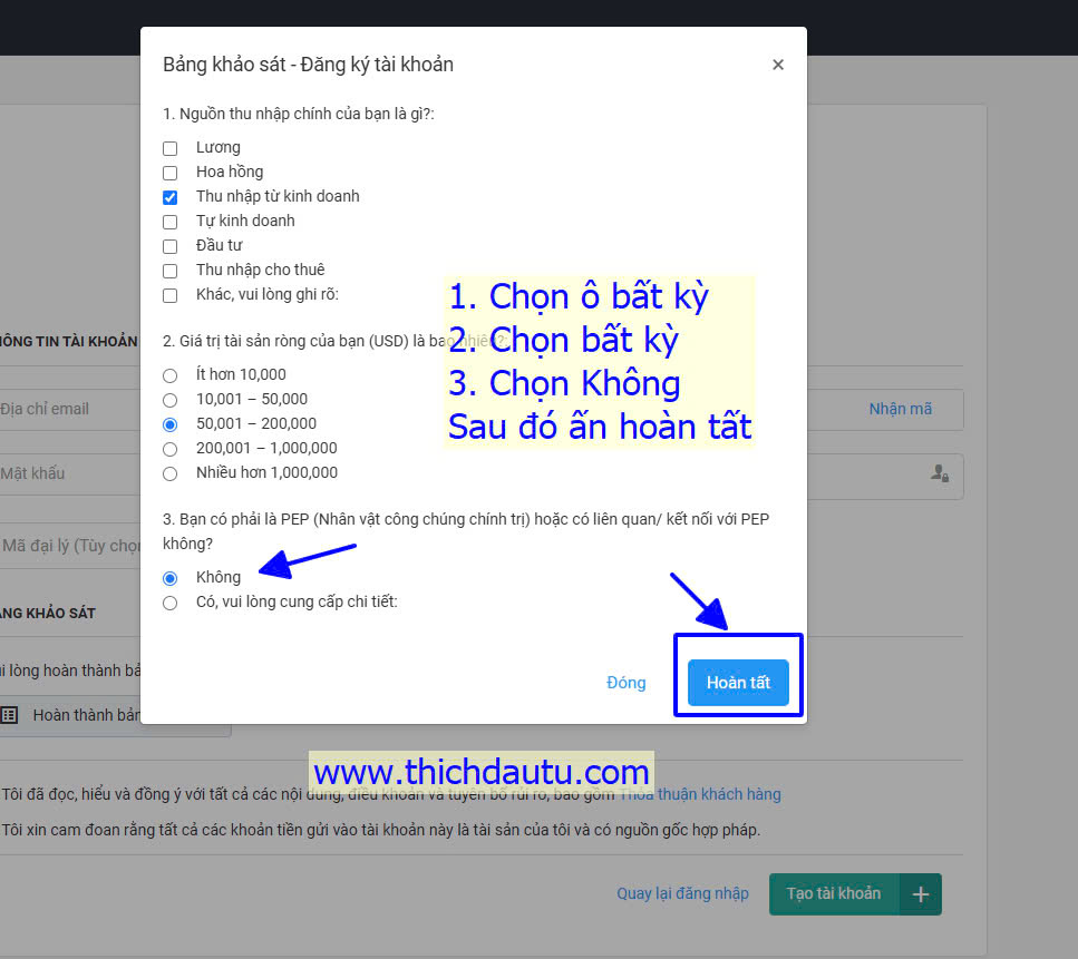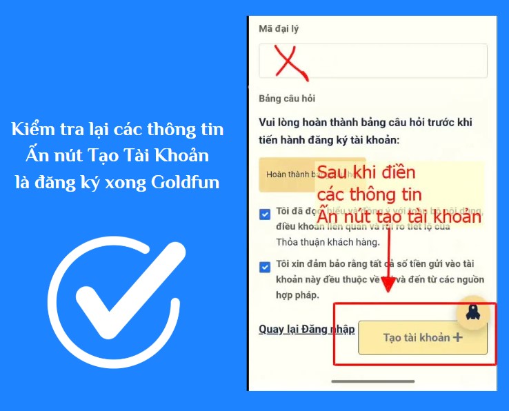 Sau khi kết thúc khảo sát, bạn ấn tạo tài khoản là xong mục đăng ký sàn giao dịch GoldFun